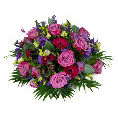 Een ronde biedermeier van 40 cm doorsnede, een ronde biedermeier van 60cm doorsnede of een langwerpig bloemstuk van 90cm lang.