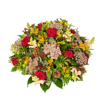 Dit rouwarrangement kenmerkt zich door het gebruik van verschillende bonte kleuren en is verkrijgbaar in 3 verschillende maten.