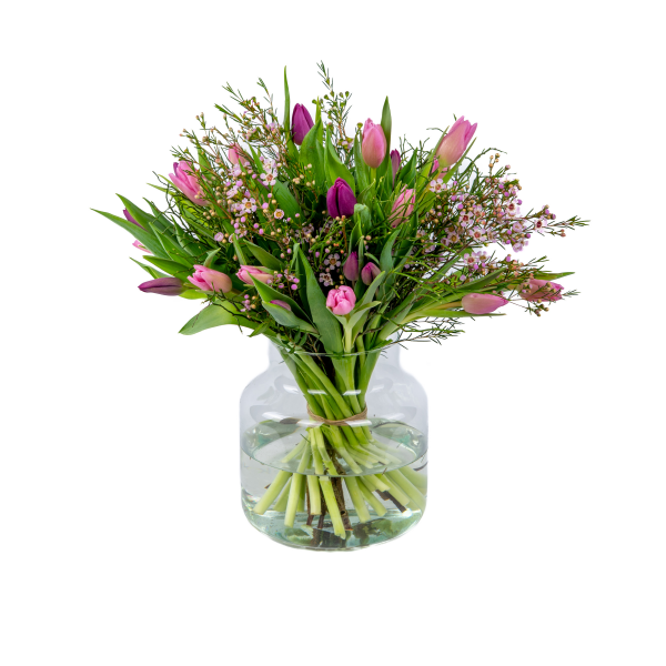 Haal het voorjaar in huis met Boeket Capri, een frisse mix van speelse tulpen en verfijnde Waxflower. De combinatie van zachtroze en dieppaarse tinten geeft dit boeket een vrolijke, veldachtige uitstraling. Een perfect cadeau om iemands dag (of je eigen woonkamer) direct op te fleuren!