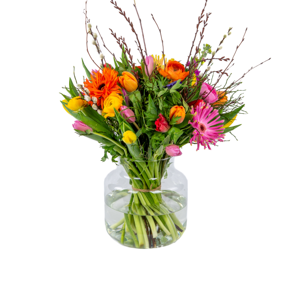 Maak je paasfeest compleet met Boeket Maja. Dit rijke boeket combineert de vrolijke kleuren met rustieke wilgenkatjes voor een speels en hoog effect. Een luxe, veelzijdige keuze die de lente in volle glorie op tafel zet.