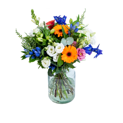 Dit boeket brengt een frisse en levendige sfeer met zijn combinatie van felblauwe bloemen, stralende oranje gerbera’s en delicate witte accenten.
