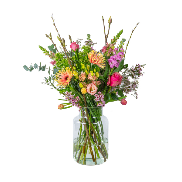 Boeket Monique is als een zonnige lentedag in vaasvorm. Met zachte pasteltinten en krachtige accenten brengt dit boeket warmte, kleur en een goed gevoel in huis. Een fijne keuze voor een verjaardag, bedankje of gewoon zomaar, omdat het leven een beetje kleur verdient.