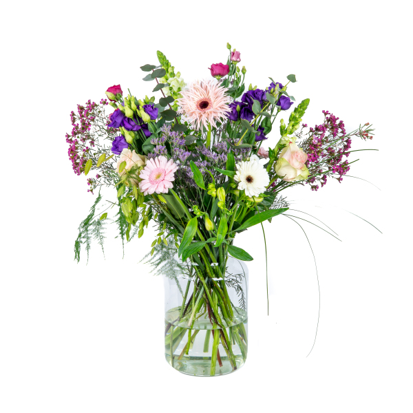 Boeket Sabrina is zacht, verfijnd en vol charme. Dit dromerige plukboeket in tinten van roze, paars en wit brengt rust en romantiek samen in een stijlvolle compositie. De speelse opbouw en frisse groentinten zorgen voor een licht en luchtig gevoel, perfect om iemand mee te verwennen of jezelf een moment van zachtheid te gunnen. Een teder boeket met een liefdevolle uitstraling.