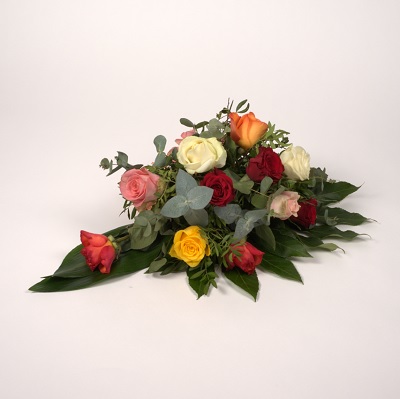 Lief rouwbloemstukje van ca 45-55 cm opgestoken met gemengde rozen en wat groen.