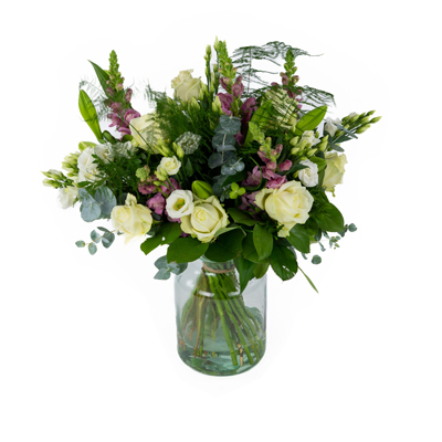 Een klassiek boeket van witte en paarse tinten.